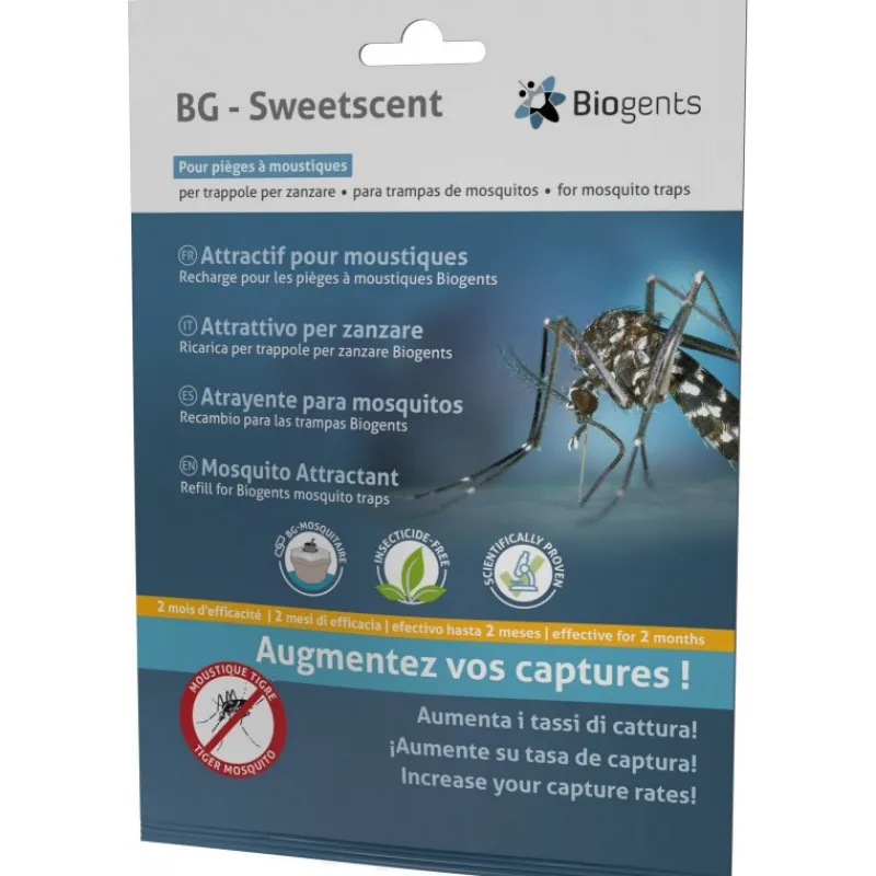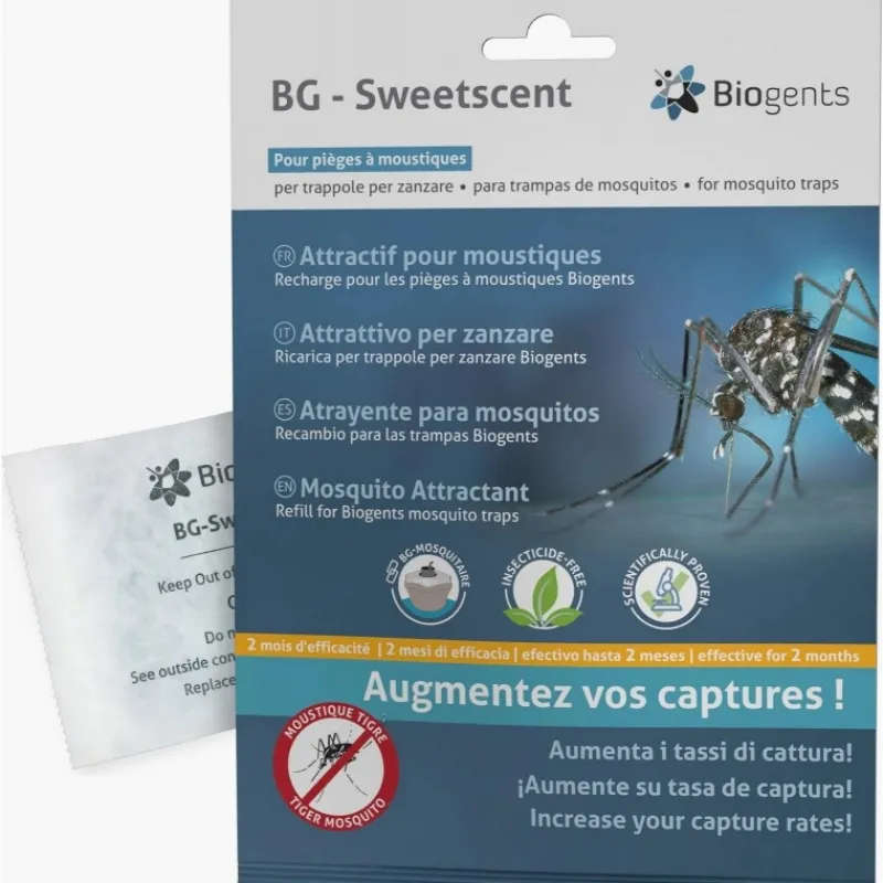 Cattura più zanzare con Biogents Sweetscent. L’attrattivo per zanzare BG-Sweetscent, ottenuto con una tecnologia brevettata da Biogents, è l’unico che simula l’odore della pelle umana senza l’utilizzo di insetticidi. La bustina viene posizionata all’interno della trappola ed è efficace fino a due mesi. BG-Sweetscent può essere utilizzato con BG-Mosquitaire (+/- CO2), BG-Home oppure con altre trappole che attraggono zanzare che pungono.