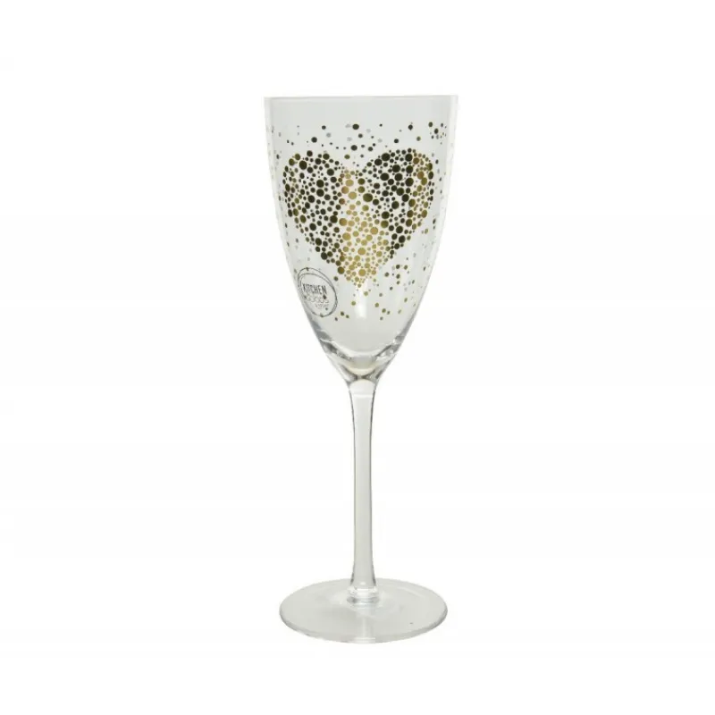Il calice presenta un design trasparente impreziosito da una delicata stampa a forma di cuore in oro. Le sue dimensioni sono di cm 8,3 x 8,3 x 23,1h, rendendolo un elemento di stile che non passerà inosservato sulla tua tavola.