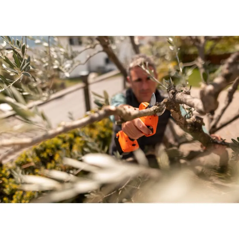 La forbice Magma E-35 TP 21V è leggera, potente e ha un design compatto ed ergonomico: una presa perfetta che non affatica la mano! L’apertura personalizzabile permette di adattarsi alle diverse dimensioni dei rami ottimizzando la potatura: l’apertura delle lame può essere impostata facilmente, per esempio per velocizzare la potatura dei rami più sottili. La sua testa snella e compatta permette di entrare agilmente tra i rami, e la robusta lama garantisce tagli fluidi e senza attriti. Il design ergonomico garantisce il massimo comfort dell’impugnatura riducendo lo sforzo e lo stress sulla mano e sul polso, grazie anche ai soli 670 g di peso senza batteria. L’operatore ha a disposizione due modalità d’uso e ampie possibilità di regolazione della lama, per una perfetta flessibilità di lavoro. Offre due modalità di taglio: