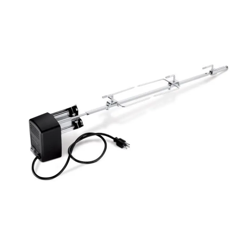 Il girarrosto Weber per barbecue a gas Spirit è dotato di uno spiedo da girarrosto con due forchettoni, che permette di cuocere un pollo intero o un grande arrosto. È alimentato da un robusto motore elettrico per assicurare una regolare rotazione per una cottura uniforme.