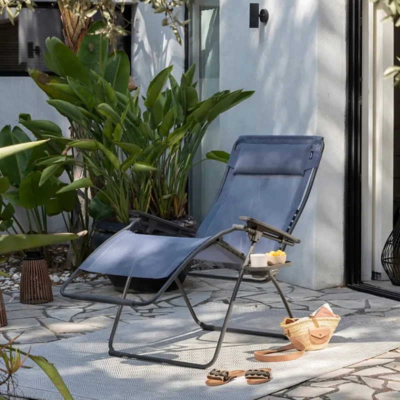 Privilegiate la generosità del comfort con questo formato XL della sdraio-poltrona multi-posizione Futura, più lunga e più larga rispetto alla versione standard. Adatta soprattutto alle grandi corporature; preserva l’ingegnosità della linea: la sua concezione vi consentirà di adottare una nuova posizione o di alzarvi senza alcuna difficoltà appoggiandovi semplicemente sui braccioli fissi. Lo schienale ergonomico offre un comfort equilibrato e un buon sostegno della schiena grazie ai fissaggi con clip che arrivano fino all’altezza delle spalle. Uno strumento indispensabile dei vostri momenti di relax all’esterno.