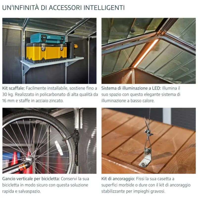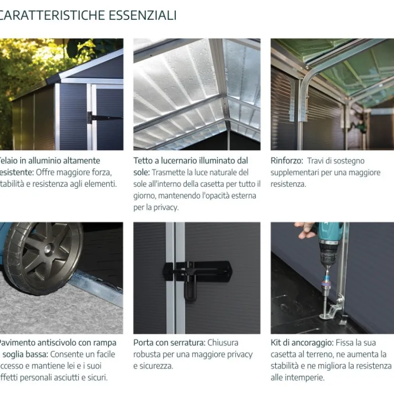 Ripostiglio ad elevata durevolezza per una multi-funzionalità e anni di eccellente protezioneIl capanno Rubicon è la scelta ideale per conservare, organizzare e proteggere la tua vita all’aperto. Realizzata con pannelli in policarbonato Palram – Canopia praticamente infrangibili e telaio in alluminio rinforzato, la capanna Rubicon si distingue per la sua robustezza e durata. Richiede poca o nessuna manutenzione, assicurando anni di protezione. È dotato di pannelli unici del tetto in policarbonato a lucernario che trasmettono la luce naturale del sole durante il giorno, pur mantenendo un esterno opaco per la massima privacy. Palram – I capannoni Canopia Rubicon non si rompono, non si piegano e non scoloriscono, resistendo a condizioni climatiche difficili come la grandine e le alte temperature.Progettato pensando al tuo spazio esterno, il capannone Rubicon completerà la tua casa e migliorerà il tuo spazio vitale esterno.