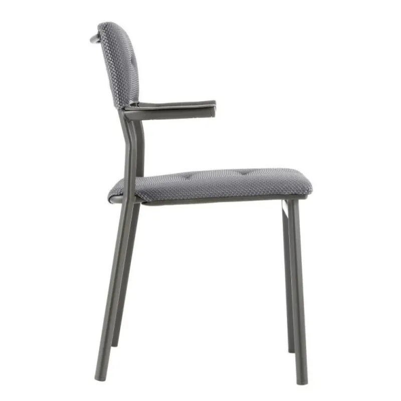 – Braccioli in alluminio ultraresistente con rivestimento in polimero puntinato ed effetto ondulato. Consente di sospendere la sedia dal tavolo per riporla facilmente o per la manutenzione del pavimento. Facile accesso alla sedia grazie ai braccioli di “media lunghezza”.