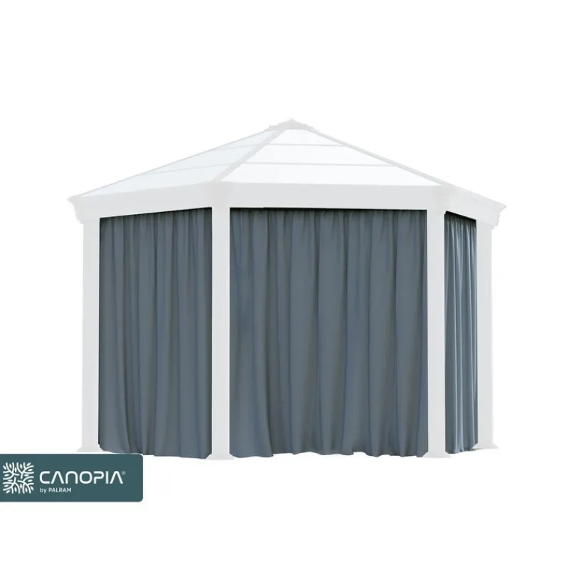 Scopri il set di tende esagonali Canopia per gazebo Monaco/Roma. Realizzate in poliestere leggero, impermeabile e resistente ai raggi UV, queste tende grigie sono facili da installare e lavabili in lavatrice. Con pannelli con cerniera per regolare la luce e garantire privacy, il set include tutti gli elementi di fissaggio. Dimensioni: 2.3×2.2m. Crea il tuo angolo di relax con Canopia!