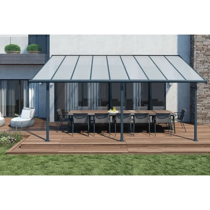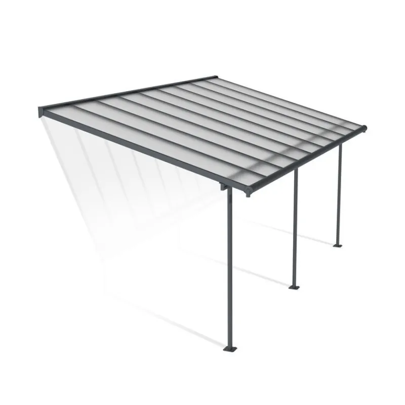 Valorizzate il vostro spazio esterno con la copertura per patio Palram – Canopia Sierra, una soluzione di copertura esteticamente gradevole e versatile. Godetevi il vostro spazio all’aperto tutto l’anno con questa aggiunta elegante e robusta. Godetevi le riunioni di famiglia e i barbecue senza preoccuparvi che il tempo capriccioso possa rovinare il vostro divertimento. Sierra è una soluzione estetica, versatile e priva di manutenzione, adatta a una varietà di applicazioni esterne, come tende da sole per balconi o patio, lettini, tende per porte, ecc.Sierra è una struttura di posizionamento potente e flessibile che consente di impostare l’altezza desiderata all’attacco della parete, la distanza dalla casa e tra i pali ovali frontali. È progettata per essere facilmente assemblata da 2 persone, con il sistema di pannelli scorrevoli che garantisce un montaggio facile e sicuro; non richiede esperienza, né abilità particolari, né strumenti speciali. Sierra offrirà alla vostra famiglia uno spazio di vita all’aperto elegante, robusto e privo di ruggine per gli anni a venire.