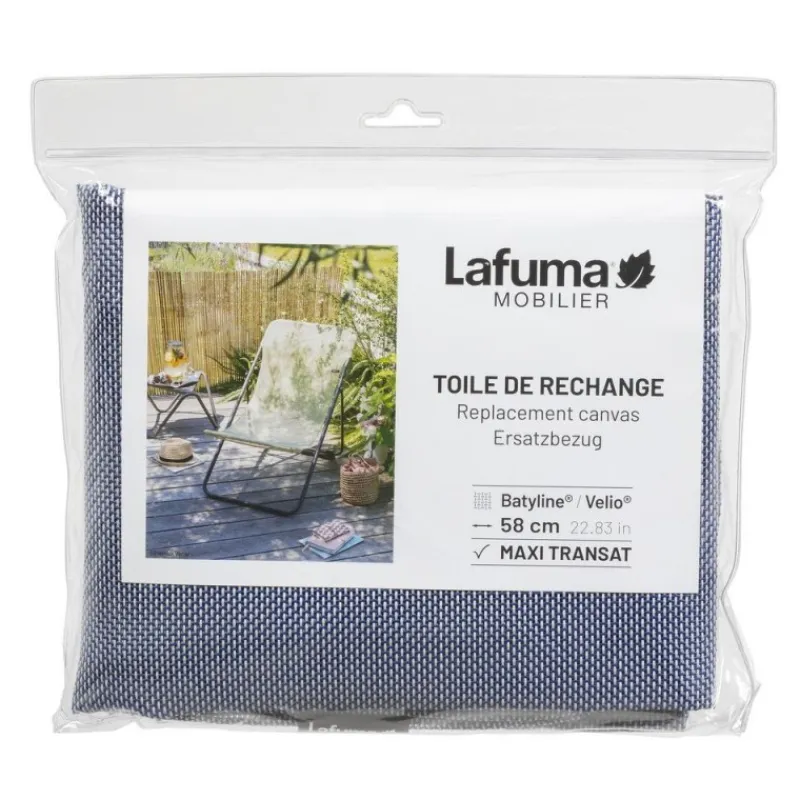 La tela di ricambio MAXI TRANSAT (Sedia a sdraio MAXI) in Batyline® ISO è molto facile da montare e vi offrirà un comfort di qualità pari all’originale. Personalizzate la vostra sdraio in base al vostro umore. Tela ideale per l’esterno: resistenza straordinaria ai raggi UV, asciugatura ultra-rapida e facile da pulire con acqua e sapone.