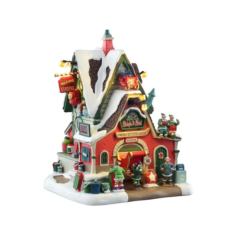 Questo affascinante pezzo da collezione rappresenta un laboratorio di riparazione di slitte e slittini gestito da elfi, perfetto per aggiungere un tocco di magia al tuo villaggio natalizio o di Halloween. Funzionante a batteria, illumina il tuo villaggio con un caldo bagliore festivo.
