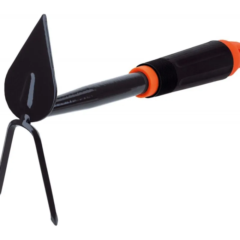 Zappetta da giardino con doppia funzionalità: la lama a cuore per zappare, il bidente per scavare. – Struttura in acciaio verniciato lucido con smalto nero – Manico di plastica dura arancione e nera Lunghezza: 29 cm Profondità: 19 cm Peso: 226 g
