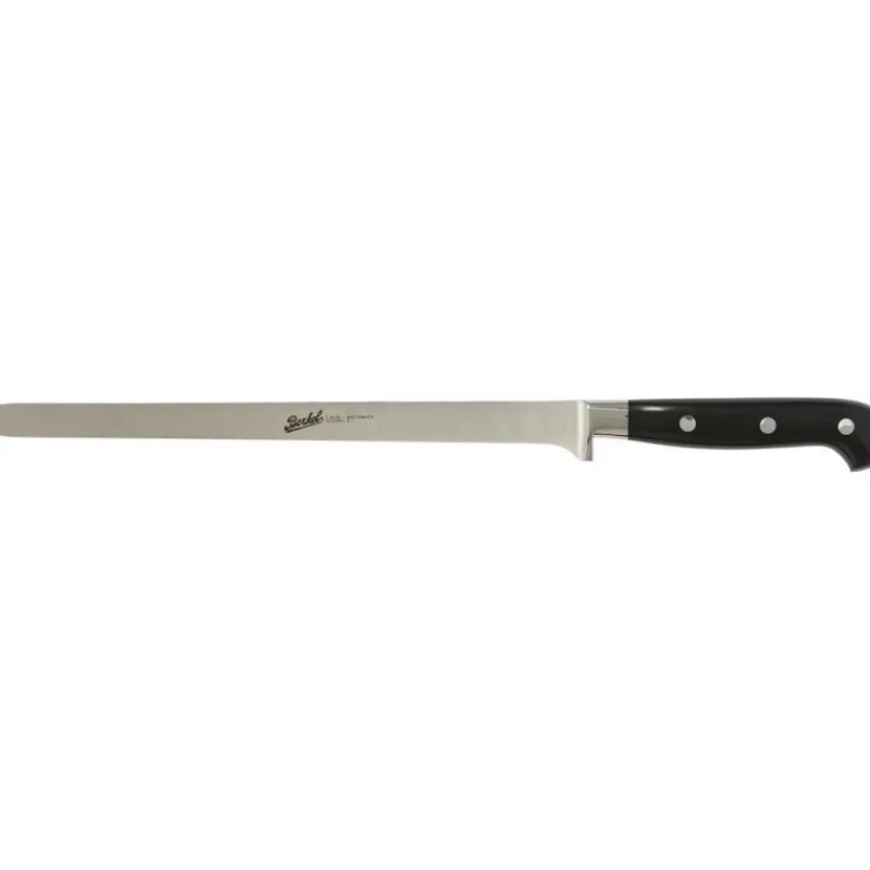 Il coltello da prosciutto con rivetti sul manico della linea Adhoc Berkel è flessibile e maneggevole. Si distingue per la lama lunga e flessibile che permette di affettare sottilmente tutti i tipi di salumi e insaccati favorendo costanza di spessore. Design sobrio e raffinato unito a materiali di pregio rendono questo coltello insostituibile per tutti gli amanti dei salumi tagliati a mano.