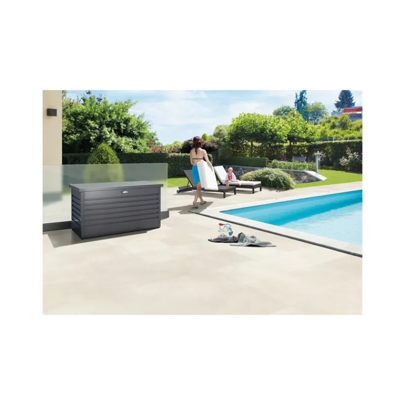 Baule da esterno in lamiera d’acciaio zincata a caldo, termoverniciatura poliammidica in 4 colori: bianco, argento metallizzato, verde scuro, grigio scuro metallizzato con serratura a cilindro con maniglia girevole e facile apertura del coperchio grazie al pistone pneumatico
