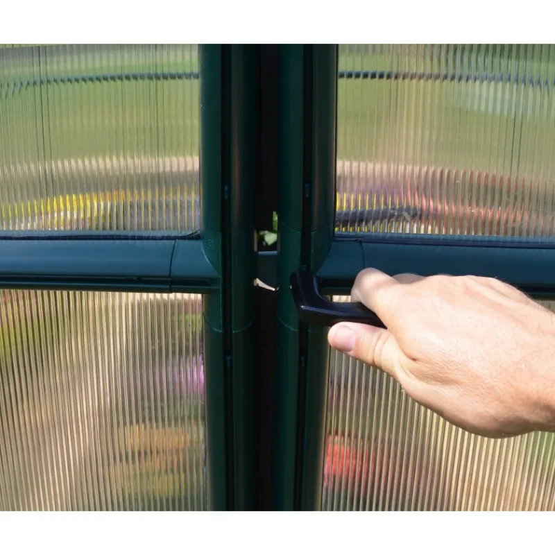 - Pannelli del tetto e delle pareti in policarbonato a doppia parete: I pannelli del tetto da 4 mm e quelli delle pareti da 6 mm proteggono dalla forte esposizione al sole e prolungano la stagione proteggendo le piante dalle gelate autunnali, fornendo al contempo oltre l’82% di trasmissione della luce