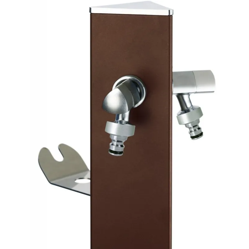 Colonnina idrica in acciaio verniciato triangolare da interrare, completa di due rubinetti e sella portatubo in acciaio inox. Accessori di fissaggio esclusi. Disponibile in 6 colori.