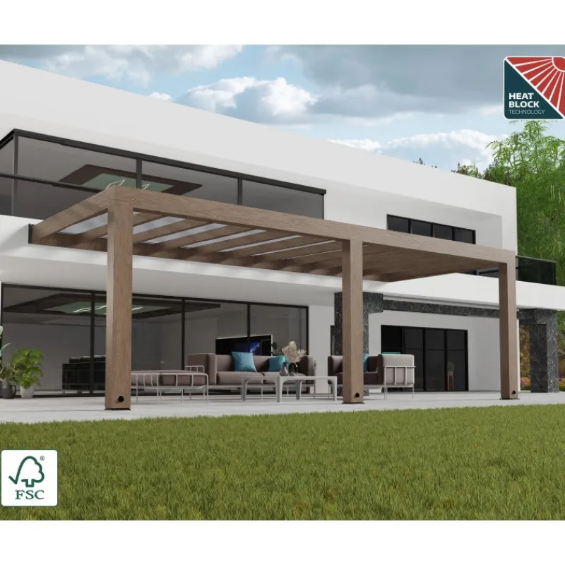 Quando ami l’ambiente che ti circonda, sei naturalmente portato a trascorrere più tempo in esso. La Copertura per Terrazza in Legno Helsinki incarna questo concetto, raggiungendo quel perfetto equilibrio tra praticità e bellezza. Non solo protegge te e i tuoi mobili dalle intemperie, ma crea uno spazio dedicato al relax e al piacere. La bellezza naturale del legno di cedro aumenta il fascino della tua area abitativa all’aperto, creando un’atmosfera calda e accogliente perfetta per ospitare una festa o goderti un momento di tranquillità all’aperto.La resistenza intrinseca del legno di cedro di alta qualità alla marcescenza, al degrado e ai parassiti lo rende una scelta eccellente per una copertura per terrazza all’aperto. La struttura massiccia con un design elegante e minimalista presenta grandi pali con grondaie integrate e pannelli del tetto Solar Control grigi, a prova di perdite, che ti permettono di goderti il tuo spazio all’aperto tutto l’anno, rimanendo fresco in estate e asciutto e protetto in inverno.Progettata pensando alla convenienza, la Copertura per Terrazza in Legno Helsinki è semplice da installare e facile da mantenere. Non c’è bisogno di riverniciarla per cinque anni, il che significa che puoi dedicare meno tempo alla manutenzione e più tempo a goderti il tuo spazio. Respira profondamente, siediti e goditi il posto in cui ti trovi.