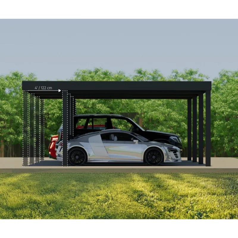 - Design moderno e flessibile: pensilina piatta per 2 auto con dimensioni generose di 6 x 6 metri, con montanti in alluminio spessi 15 x 15 cm. I pali possono essere posizionati sul bordo o regolati fino a 1,22 metri all’interno per un uso flessibile.