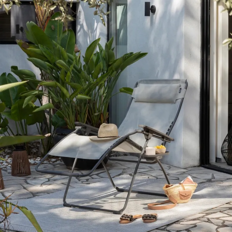 Privilegiate la generosità del comfort con questo formato XL della sdraio-poltrona multi-posizione Futura, più lunga e più larga rispetto alla versione standard. Adatta soprattutto alle grandi corporature; preserva l’ingegnosità della linea: la sua concezione vi consentirà di adottare una nuova posizione o di alzarvi senza alcuna difficoltà appoggiandovi semplicemente sui braccioli fissi. Lo schienale ergonomico offre un comfort equilibrato e un buon sostegno della schiena grazie ai fissaggi con clip che arrivano fino all’altezza delle spalle. Uno strumento indispensabile dei vostri momenti di relax all’esterno.