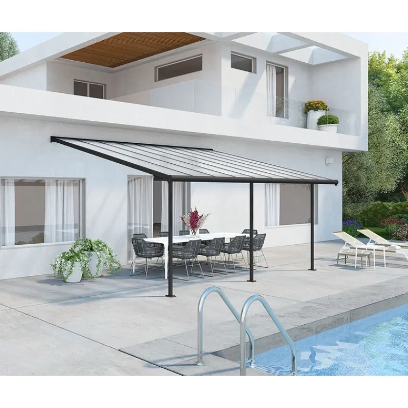 Valorizzate il vostro spazio esterno con la copertura per patio Palram – Canopia Sierra, una soluzione di copertura esteticamente gradevole e versatile. Godetevi il vostro spazio all’aperto tutto l’anno con questa aggiunta elegante e robusta. Godetevi le riunioni di famiglia e i barbecue senza preoccuparvi che il tempo capriccioso possa rovinare il vostro divertimento. Sierra è una soluzione estetica, versatile e priva di manutenzione, adatta a una varietà di applicazioni esterne, come tende da sole per balconi o patio, lettini, tende per porte, ecc.Sierra è una struttura di posizionamento potente e flessibile che consente di impostare l’altezza desiderata all’attacco della parete, la distanza dalla casa e tra i pali ovali frontali. È progettata per essere facilmente assemblata da 2 persone, con il sistema di pannelli scorrevoli che garantisce un montaggio facile e sicuro; non richiede esperienza, né abilità particolari, né strumenti speciali. Sierra offrirà alla vostra famiglia uno spazio di vita all’aperto elegante, robusto e privo di ruggine per gli anni a venire.