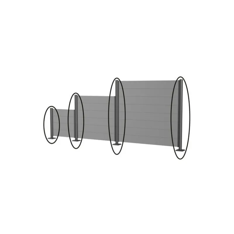 Saranno installati in un basamento a plinti da 15×15 cm (LxP) I supporti devono essere utilizzati come elementi iniziali, finali, angolari o anche come montante di collegamento per elementi Frangivista. Diametro: 10 cm.