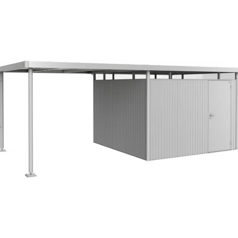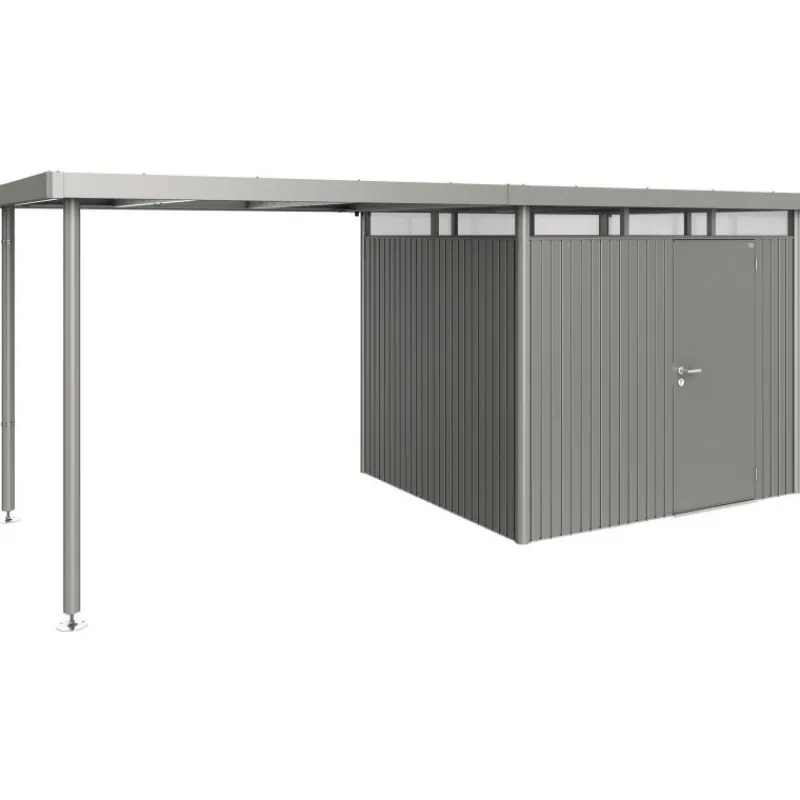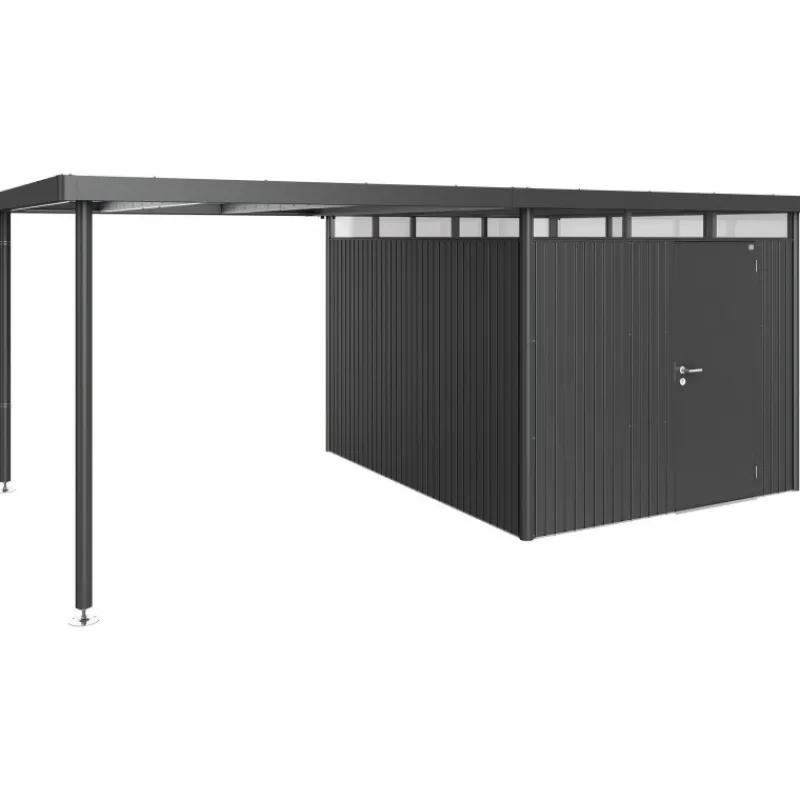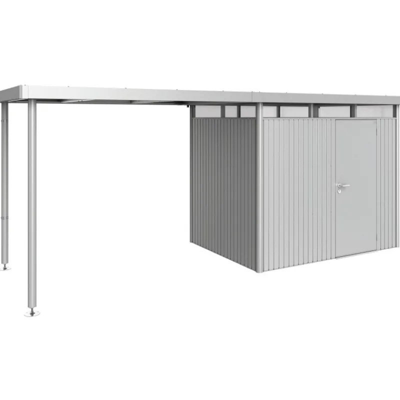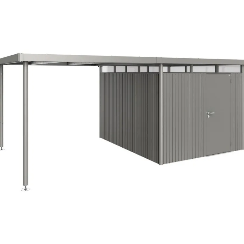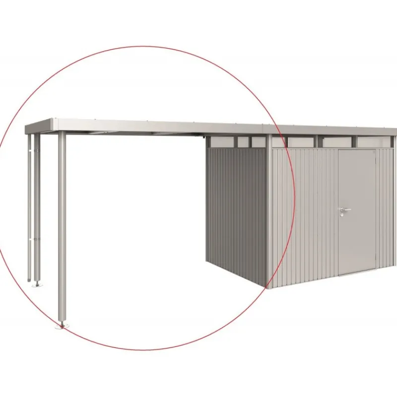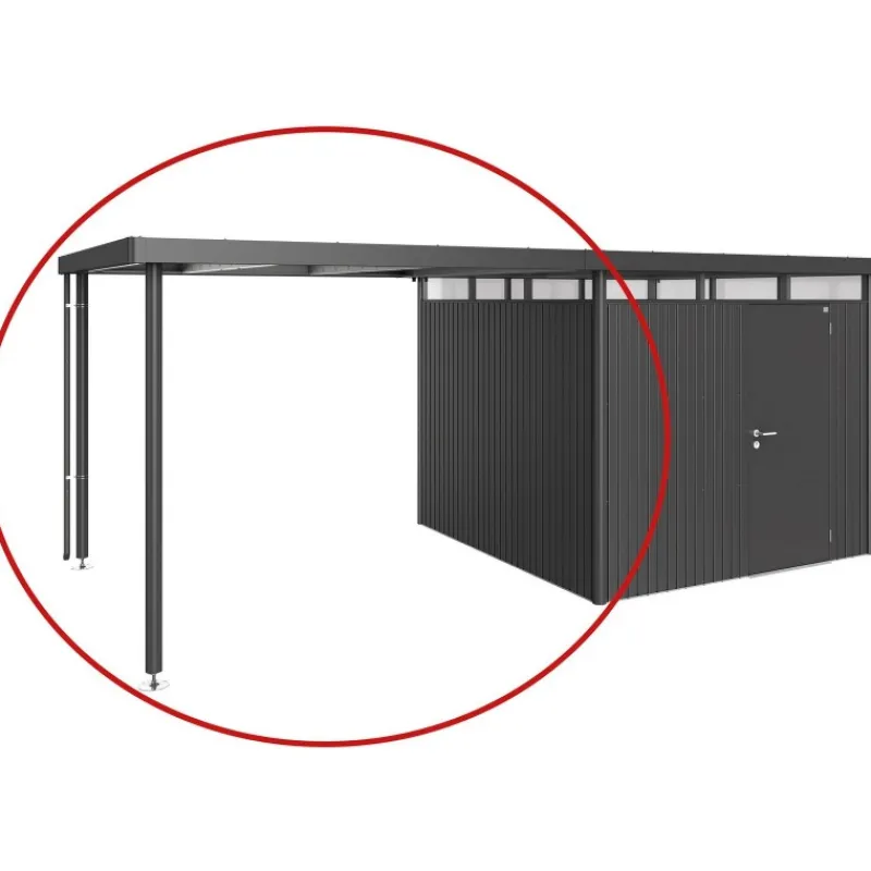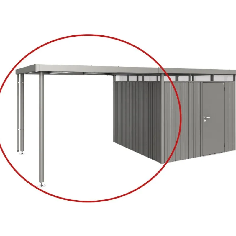 La tettoia laterale viene fissata alla casetta porta attrezzi HighLine (a partire dalla mis. H2) dalla parte con la grondaia, su uno o su entrambi i lati, a seconda delle preferenze. È disponibile in due diversi formati. I supporti in alluminio sono dotati di piedini regolabili in altezza. Il tubo pluviale è incluso. Il tetto della tettoia laterale è sempre grigio quarzo metallizzato.